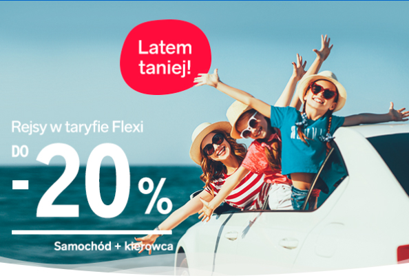 * Promocja dotyczy transportu samochodu z pasażerami oraz osób pieszych w taryfie Flexi; nie dotyczy innych taryf, ani innych wyjazdów, w tym rejsów turystycznych, nie dotyczy innych usług (kabin, posiłków itd).